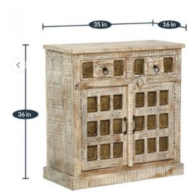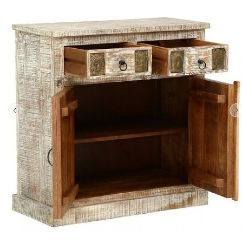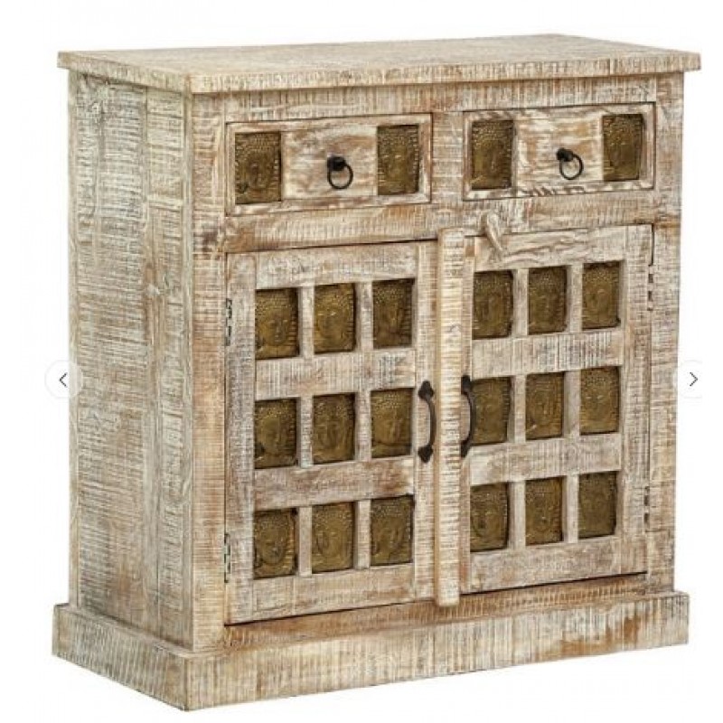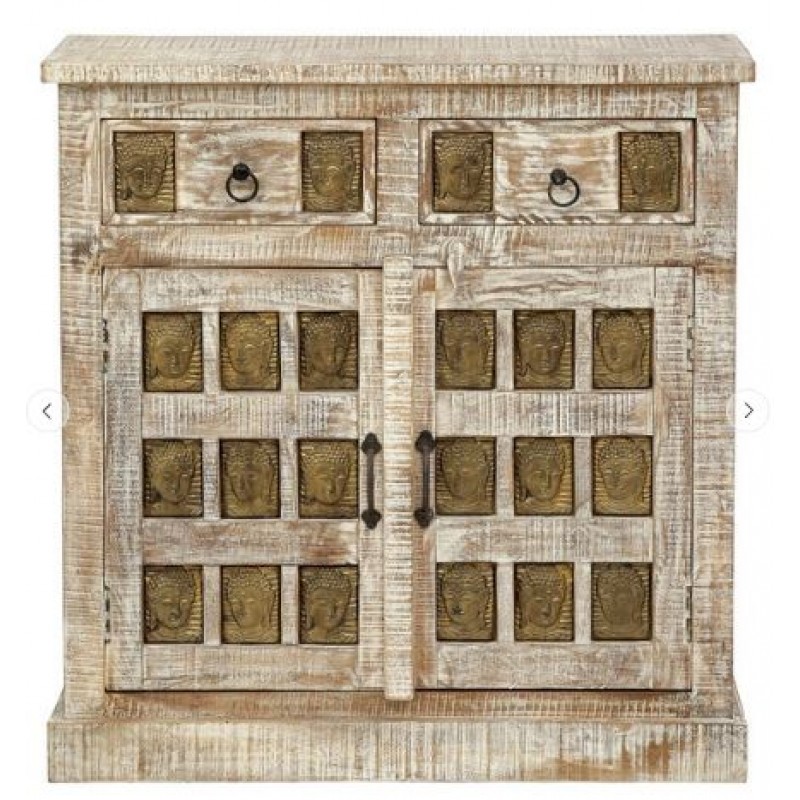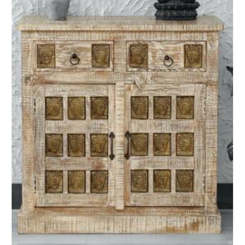 Wooden Cabinet In White Distress Finish With Buddha Face In Front Door & Drawer