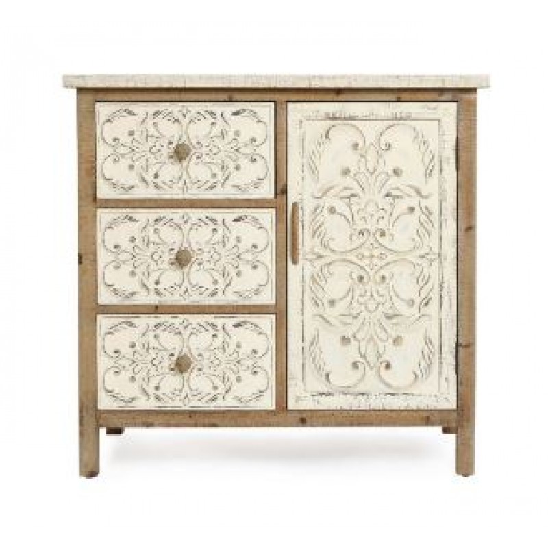 Wooden Cabinet In White Distress Finish With Carving